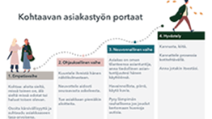 Blogin kuvassa on esitelty kohtaavan asiakastyön portaat, jotka koostuvat neljästä vaiheesta: 1. eli empatiavaiheessa aloitetaan sieltä, missä asiakas on, eikä sieltä, missä haluaisi asiakkaan olevan, osoitetaan kärsivällisyyttä ja suhtaudutaan asiakkaaseen tasa-arvoisesti. Lisäksi tapaamiseen annetaan jotain itsestä. 2. eli ohjauksellisessa vaiheessa kuunnellaan ihmistä hänen näkökulmastaan, neuvotellaan aidosti seuraavasta askelesta ja tuetaan asiakkaan pieniäkin aloitteita. 3. eli neuvonnallisessa vaiheessa asiakas on oman tilanteensa asiantuntija, havainnollistetaan, piirretään ja käytetään kuvia sekä pysytään rauhallisena, jos joudutaan välittämään huonoja uutisia. 4. eli viimeinen vaihe on nimetty hyvästelyksi. Siihen kuuluvat kannustaminen ja kiittäminen, prosessin kannattelu kotitehtävällä ja jälleen asiakastyötä tekevä antaa jotain itsestään.