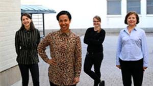 Kuvassa Moninaisesti parempi -hankkeen tutkimuspäällikkö Shadia Rask, projektikoordinaattori Sanna Nykänen sekä rekrytointikokeilussa valitut projektitutkijat Mercédesz Czimbalmos ja Hülya Yüksel.