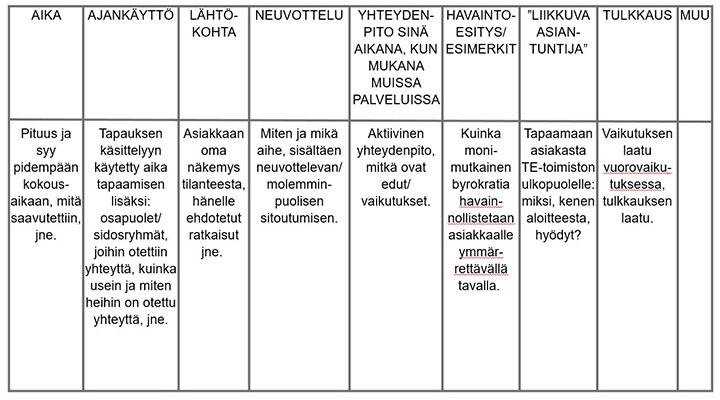 Kuten taulukosta käy ilmi, kunkin tapaamisen prosessi on erittäin hyvin rakennettu. Lisäksi prosessin kirjaaminen kertoo paljon prosessin laadullisista tekijöistä. Kun luin kollegoideni dokumentoimia vuorovaikutustilanteita, sain käsityksen muilla alueilla käytössä olevista ohjeistuksista ja toimintatavoista sekä hankkeen TE-toimistossa työskentelevien asiantuntijoiden havainnoista ja työn laadullisista seikoista.