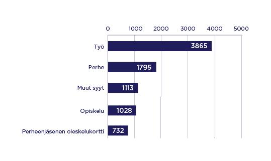 Suomen muutetaan monesta syystä. Tärkeimmät syyt ovat viime vuosina olleet suuruusjärjestyksessä perhe, työ, opiskelu ja kansainvälinen suojelu. Erityisesti työperusteinen maahanmuutto Euroopan ulkopuolelta on ollut kasvussa. Vuonna 2019 ensimmäisiä oleskelulupia myönnettiin yhteensä 25 412, minkä lisäksi myönteisiä turvapaikkapäätöksiä tehtiin 2 959 (Kuvio 2). EU-kansalaisten rekisteröintejä oli 8 533 (Kuvio 3. Eri perustein Suomeen muuttaneiden maahan jäämisen pysyvyyttä tullaan arvioimaan erillisessä selvityksessä.