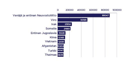 Maassa asuvista ulkomaan kansalaisista viisi suurinta kansalaisuutta vuonna 2019 olivat Viro, Venäjä, Irak, Kiina ja Ruotsi. Ulkomaalaistaustaisista kaksi selvästi suurinta ryhmää vuonna 2019 olivat Venäjä ja entinen Neuvostoliitto sekä Viro (Kuvio 4). Samana vuonna Suomeen muutti eniten ulkomaan kansalaisia Venäjältä (2 273), Virosta (1 724), Turkista (1 377), Intiasta (1 283) ja Irakista (1 182). Aiemmin Suomeen muutettiin pääosin Euroopan maista ja lähialueilta (erityisesti Virosta, Venäjältä ja entisestä Neuvostoliitosta), mutta maahanmuuton kasvun myötä myös sen rakenne on jossain määrin muuttunut. Erityisen nopeasti on kasvanut maahanmuutto Aasiasta (35 % kaikista ulkomaan kansalaisista vuonna 2019), mutta samalla Eurooppa (ml. EU:n ulkopuoliset maat) on säilynyt suurimpana lähtömaanosana (53 % kaikista saapuneista 2019).