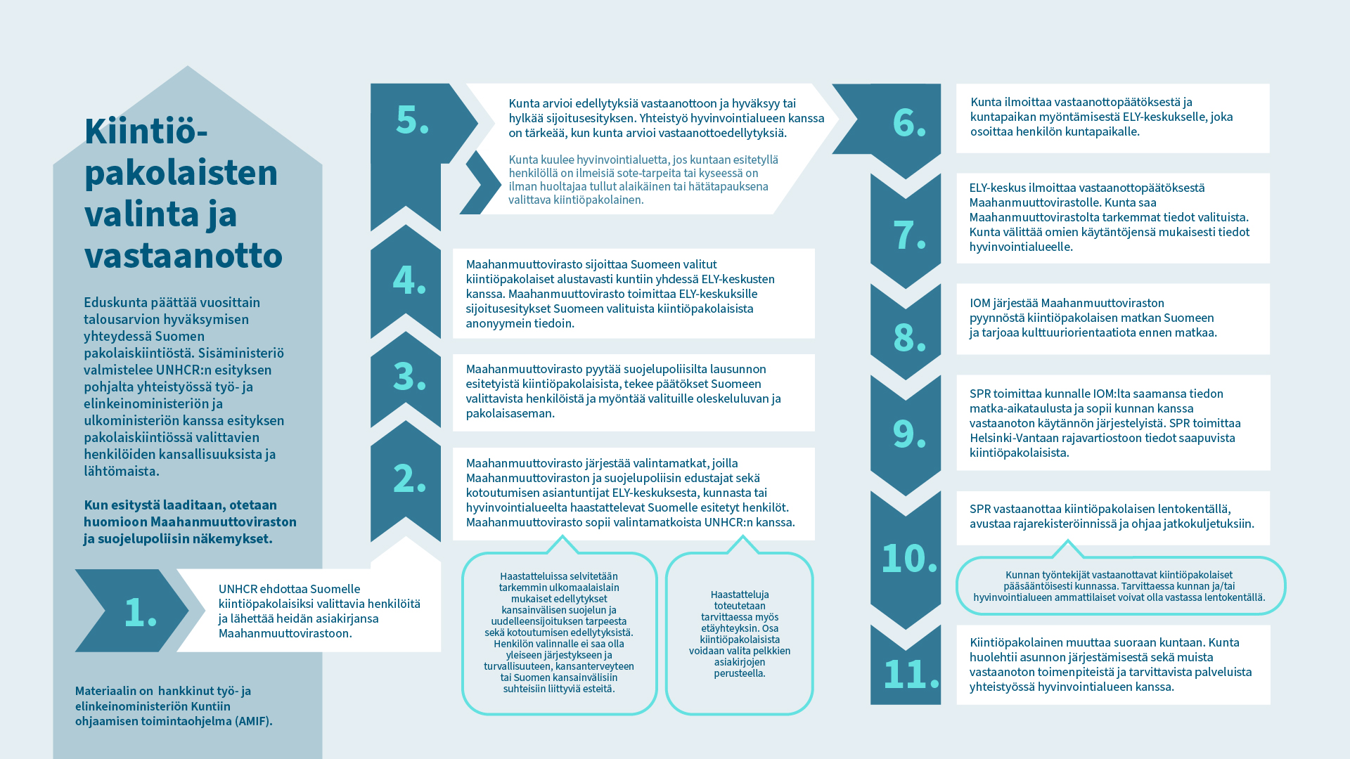 Materiaaleissa kuvataan yleisellä tasolla pakolaisten vastaanoton ja kuntiin siirtymisen vaiheita eri pakolaisryhmittäin. Prosessikuvauksien tavoitteena on lisätä tietoa pakolaisten vastaanotosta sekä tukea sujuvaa vastaanottoa ja monialaista yhteistyötä. Materiaalit ovat vuonna 2023 voimaan tulleen lainsäädännön mukaisia.